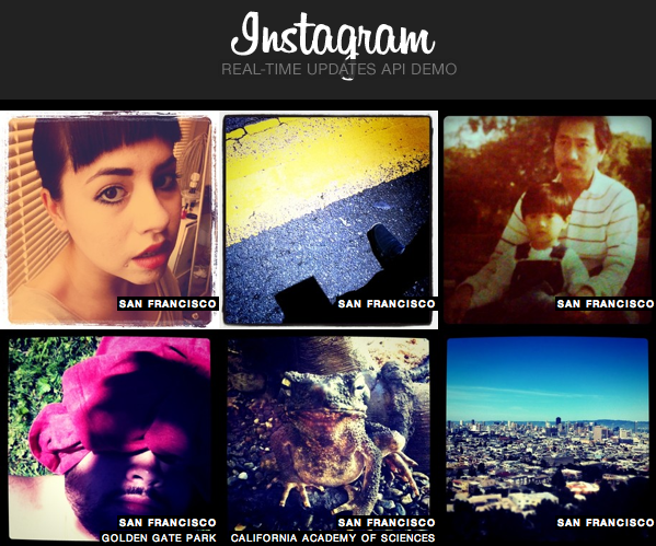 Instagram Real-time API Demo: Instagram 官方给出的一个实时应用,服务器实时推送最新上传的照片到浏览器上显示。 基于Socket.io模块实现的。